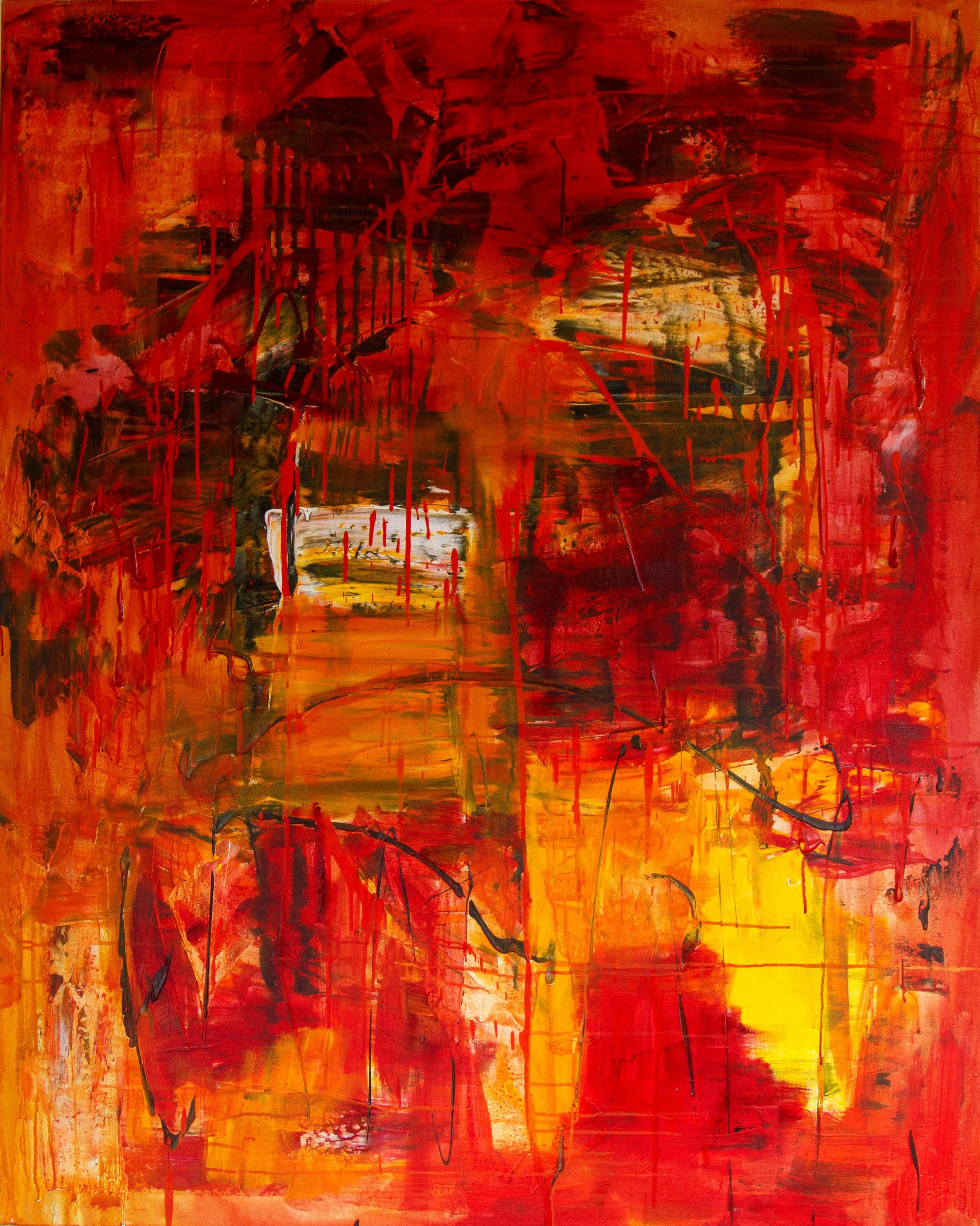 Med glødende hænder og brusende blod i mine årer, bliver mine værker til. Farvernes leg på lærredet flyder som intuitivt dansende bevægelser, ledsaget af musik, som understøtter den stemning, jeg befinder mig i. Med lette arme og frie dyp i malingen, bliver værkerne til, strøg for strøg. Jeg er hengivet et magisk øjeblik, uden tanke på det færdige resultat.